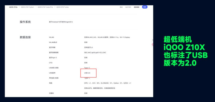 再比如,USB接口类型这个数据,就连一向参数透明度很高的小米都是选择性标注,很多低端机比如红米Note15就没标注。而vivo 则不然,全系产品、不论高中低档都标注了版本。 如下图所示,这是一款售价800多块钱的iQOO Z10X,也标注了USB版本为USB2.0,属实难得。