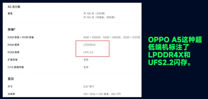 整体来说,小米的产品信息一致性虽然没有vivo那么突出,但是在产品的细节信息展示上,要做的比vivo略强一点(部分机型)。 OPPO这边也不错,但是在产品信息一致性以及信息的完整性和细节性上均不如小米和vivo,位居第三位。 他在摄像头防抖规格、USB版本信息、定位信息上也会做一定的区隔展示,另外就是在一些信息的丰富度上做的不够好,但是相比于剩下几个品牌要好的多了,起码信息是相对完整的。 大家请一定注意,这哥仨已经算是整个手机行业的“优等生”了,因为他们起码都准确、真实的展示了闪/运存的规格(也就是LPDDR/UFS的规格),总体上也没有太多重要的漏项。