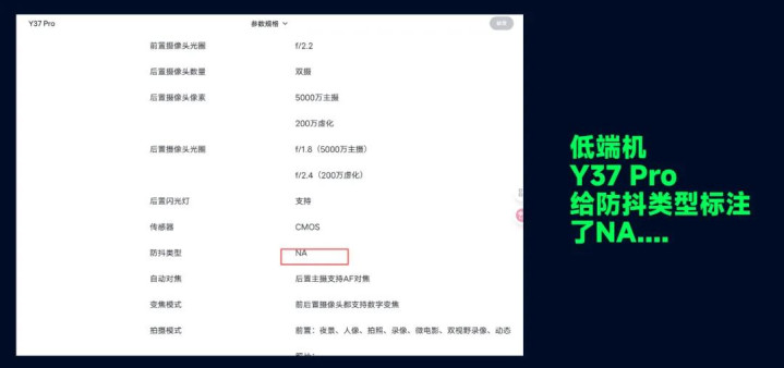 接下来,给大家说一下调查完后的结论性数据。 首先,总体来说,在信息透明度上做得最好的品牌是vivo和小米,几乎都做到了该有的信息都有所标注。 这俩品牌各有特色,我们分开来讲一下。 vivo这边的优势是不同机型的信息一致性非常高,几乎做到了全价位段、不管高中低档手机的信息展示基本一致、一视同仁、应标尽标,这一点做的甚至比小米还强。(就别说其他品牌了) 给大家举个例子,就拿摄像头防抖这个参数来说,其他绝大多数厂商基本都是在所涉及的机型本身有OIS/EIS才标,没了就直接忽略不标,只有vivo这边很实在的标了一个Na...看到这个Na有点绷不住了。