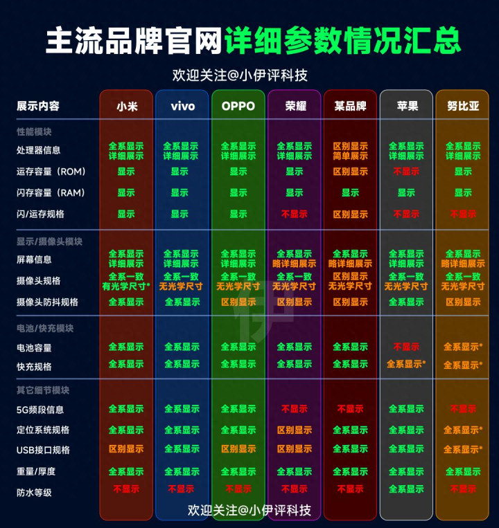 | 在昨天的文章——《为了让你查不到手机信息,手机厂商也是煞费苦心了》中,已经给大家做了预告。 很多手机厂商为了不让消费者看到自己产品的一些短板信息,直接在手机“参数规格”,这个原本应该相对客观详实的展现手机各项参数的地方,进行了“选择性”展示——自己产品有优势的选择展示,没有优势的干脆就不展示。 在那篇文章中我也给大家预告了,我会给大家做一期详尽的调查,来看看国内主流手机品牌中,哪一家手机厂商的“详细信息”做的最详实。 那么废话不多说,今天就来了,惯例还是一图流,如下所示:(为了调查我也是费了好大得劲,大家多多支持转发一下)