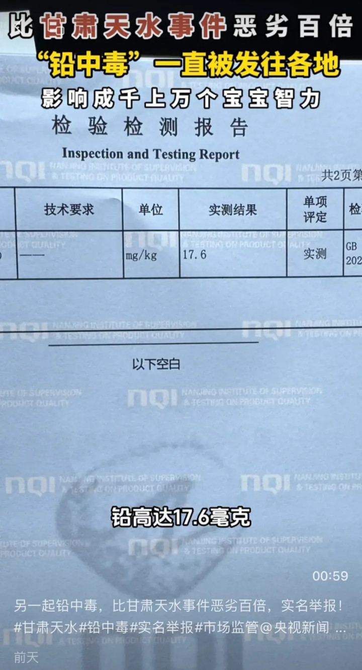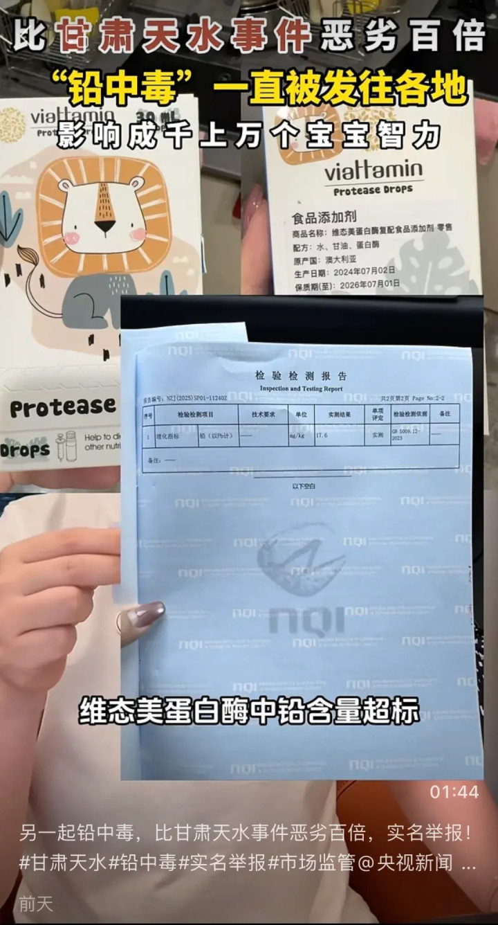 今年7月,天水市麦积区培心幼儿园使用“不可食用”的彩绘颜料替代食品添加剂,导致食品铅含量超出国家标准2000余倍,233名幼儿食用后均被检出不同程度血铅异常,引发社会广泛关注和热议。 然而,一波未平一波又起。近日,一则实名举报在社交媒体持续发酵。消费者吴梦莹女士通过各社媒平台公开指控称,婴童膳食营养补充剂“维态美蛋白酶”的铅含量严重超标,不仅致自家6月龄婴儿“铅中毒”,还不断向全国各地销售影响成千上万的宝宝。